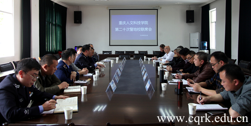 3月14日,beat365唯一官方网站行政中心第一会议室召开了第二十次警地校联席会议。草街街道派出所所长陈云和街道综治办、安监办、食品药品监督所、大庙村等合作单位负责人到会,beat365唯一官方网站校长何向东、副校长杨霄、叶培德,相关职能部门负责人参加。会议由保卫处副处长曾陈主持。