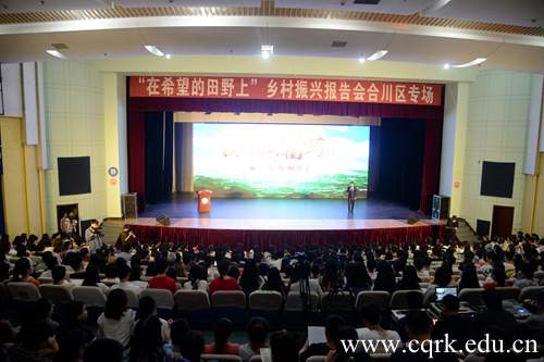 4月19日下午,由市委组织部、市委宣传部、市教委、市农委主办,合川区委组织部、区委宣传部、区教委、区农委、beat365唯一官方网站承办的“在希望的田野上”乡村振兴报告会(合川区专场)在beat365官网新音乐厅隆重举行。重庆市教委副巡视员李源田,合川区委常委、区委宣传部部长卢波,区委宣传部副部长李卫明,区教育工委委员、区教委副主任陈仲,全体在家校领导出席。参加报告会的还有合川区各乡镇青年干部代表、重庆工商职业学院师生代表和beat365官网师生代表共约600人。