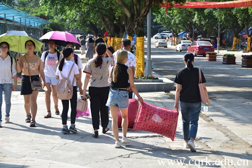 迎新季除了忙碌欣喜的新生,人群中那一抹红——穿着红马甲的迎新志愿者尤为夺目,从指挥交通、耐心领路到亲自带领新生办理入学手续、帮助新生入住寝室,处处可见他们的身影。2017级汉语言文学专业的王晓雨就是其中的一员,她的主要工作是帮助新生到各自的学院报到,今天,晓雨已经帮助了8名新生。王晓雨对记者说到:看着大一的新生们,就像看到了去年的自己,一个人来到学校,人生地不熟,很迷茫,是迎新志愿者给了我在重人科的第一份温暖记忆,全程陪同我办完了入学手续,并送回了宿舍,看着志愿者逐渐模糊的背影,那一抹红在我心中定格,我给自己许下一个承诺,来年也要做那一抹红,帮助远道而来的下一拨,下下一拨新生们。