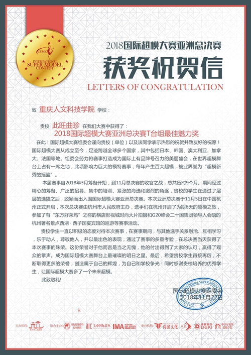 11月9日,2018国际超模大赛亚洲总决赛在杭州举行,本次大赛汇聚了来自中、日、泰等多个国家的60多名选手,共同开启了一场时尚超模盛典。beat365官网文学与新闻传播学院2016级新闻学2班学生此旺曲珍在比赛中荣获最佳魅力奖,并将于2019年随同超模组委会赴加拿大参加超模邀请赛。