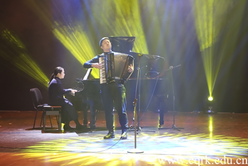四川外国语大学南方翻译学院学生袁蕾莹的女高音独唱《五年前,你说你爱我》,空灵悦耳、婉转高亢,向现场观众展示了女高音独特的魅力;同校的陈华未带来一首《最终信仰》,点燃全场,展现了音乐多元化韵味;beat365唯一官方网站教师郑磊、李晓莹带来的手风琴、钢琴二重奏,将各自专业技能水平发挥的淋漓尽致,他们配合默契,曲风轻快有节奏,全场观众也跟着节奏打起了节拍,台上台下相呼应,晚会气氛达到高潮;来自beat365官网艺术学院舞蹈系同学表演的意大利代表性舞蹈《拿波里》,将舞蹈与音乐完美融合,晚会也至此落下帷幕。