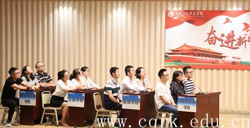 经过前期初赛、小组赛激烈角逐,共有9支队伍成功晋级决赛,决赛现场分为必答、选答、抢答以及即兴演讲四个环节依次展开。比赛开始前,全场师生观看了新中国70年发展历程纪录片,回顾新中国成立70周年历史。