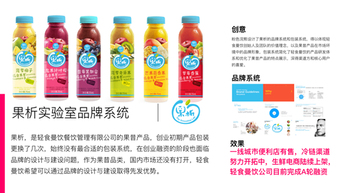 2017年至2018年间,成功帮助创业公司设计其品牌—果析,构建出媲美英国Innocent的果昔饮品品牌,一举在新品类果汁中脱颖而出,目前产品已遍布一线城市便利店;联合中国生物制药集团,推出的快消型医用商品,所属旗下饮品公司推出的高端水品牌;同传统连锁店品牌─华北区继光香香鸡品牌和独立咖啡品牌珠荟啡签订长期合作。