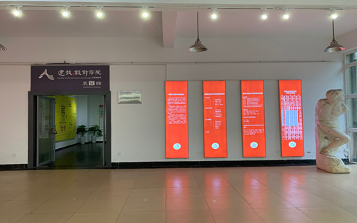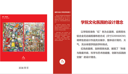 本次文化建设设计整体以学院标准色“红”色为主基调,应用背光铝合金无边画框绷布的方式将师生的设计作品充分展示,整体设计简约、大气,充分体现学院的学科特点。