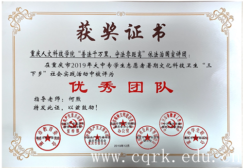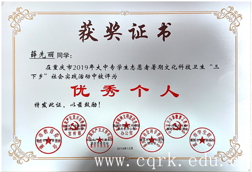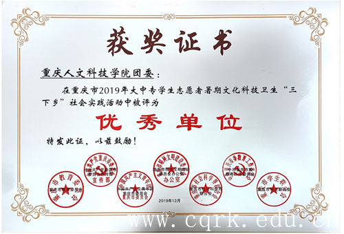 近日,市委宣传部、市文明办、市委教育工委、市教委、团市委、市社会科学界联合会、市学联对在2019年重庆市大中专学生志愿者暑期文化科技卫生“三下乡”社会实践活动中表现突出的优秀集体与个人进行了通报表扬,beat365官网团委荣获“优秀单位”荣誉称号,护理学院“爱心医疗在路上,健康扶贫青春行”爱心医疗服务团、政治与法律学院“普法千万里,守法零距离”依法治国宣讲团荣获“优秀团队”荣誉称号,校团委张扬老师获“先进工作者”荣誉称号,学前教育学院2017级薛先丽同学荣获“优秀个人”荣誉称号。