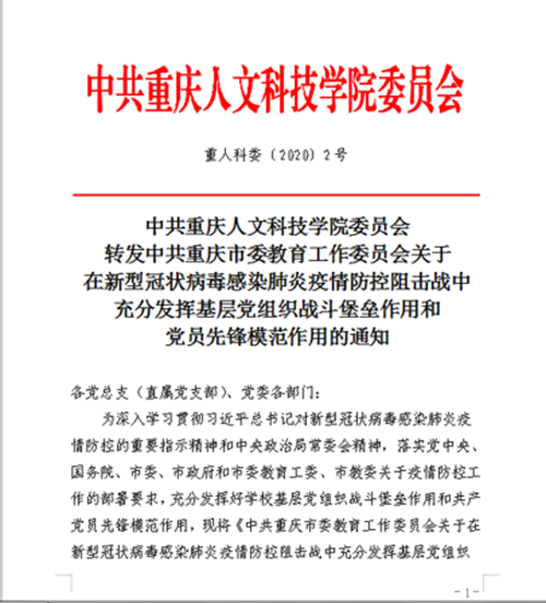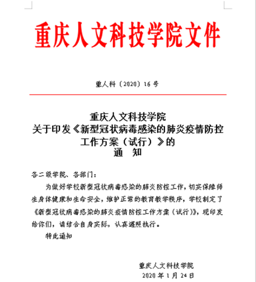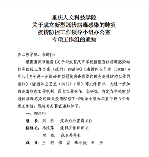 1月24日,学校第一时间成立疫情防控工作领导小组,制定疫情防控工作预案,印发了《beat365唯一官方网站新型冠状病毒感染的肺炎疫情防控工作方案(试行)》,全面启动疫情防控工作。校领导在岗值班,建立专班、落实专人负责,强化责任意识,层层压实工作责任,确保各项防控工作依法依规、抓细抓实。1月26日晚上,校党委书记张卫平主持召开学校新型冠状病毒感染的肺炎疫情防控工作专题电话会议,第一时间传达学习贯彻习近平总书记在中央政治局常委会上关于新型冠状病毒感染的肺炎疫情防控工作的重要讲话精神和全市新型冠状病毒感染的肺炎疫情防控工作视频会议精神。1月29日学校转发《中共重庆市委教育工作委员会关于在新型冠状病毒感染肺炎疫情防控阻击战中发挥基层党组织战斗堡垒作用和党员先锋模范作用的通知》,1月31日,下发《beat365唯一官方网站关于成立新型冠状病毒感染的肺炎疫情防控工作领导小组办公室专项工作组的通知》,保证疫情防范工作落到实处。