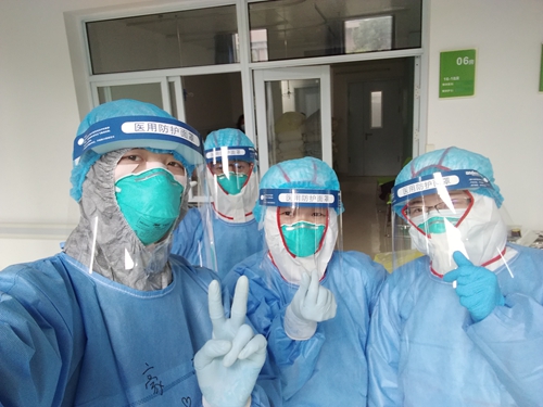 准备进入病区的吴豪杰(左一)和他的战友们