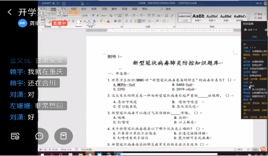 特殊的时期,别样的形式。学校各学院辅导员创新思路,精心组织,利用新媒体手段,于2月25日-3月1日期间利用QQ、钉钉等线上软件,采用文字、图片、短视频、直播等方式,统筹课程学习和战“疫”专题教育,强化爱国主义教育引领,注重将战“疫”先进事迹教育和防疫知识、生命教育、公共安全教育、心理健康教育等作为重要思想政治教育内容。通过防疫知识互动竞答、趣味小游戏、谈心聊天等形式,向同学们普及新冠肺炎疫情防控知识,强调治安、消防、交通、食品、网络、疫情防控等方面的防范措施和注意事项,提醒同学们无论在家还是外出都要提高安全防范意识,注意自身安全。同时全面了解同学们的学习生活状态和心理状态,积极疏导负面情绪,帮助同学们更好地规划在线教学期间的作息时间,以更加积极健康的面貌迎接新学期的学习和生活。