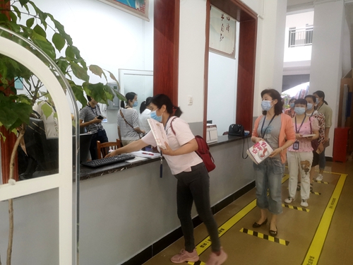 演练共分为两个部分,一是读者入馆演练,二是突发情况处置演练。预约好座位的读者在图书馆入口外佩戴好口罩,间隔1米距离排队等候入馆,依次就体温检测、扫码签到、刷卡入馆、分座阅览、间隔借书、扫码退坐等环节予以演练。当发现体温异常者,按照规定流程及时上报,工作人员将其带入隔离区,询问情况并做好登记。