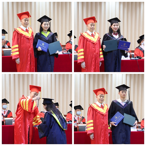 张跃光向毕业生代表颁发毕业证书,向获得学士学位的毕业生代表授予学士学位证书。