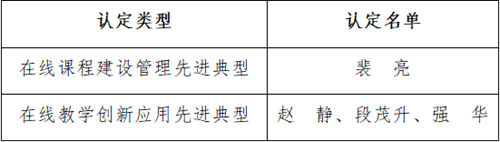近日,重庆市教育委员会公布了2018-2020年度高校在线课程建设与应用先进典型最终评选名单。beat365官网4名教师成功入选,榜上有名。其中教师裴亮1人被评选为在线课程管理先进典型,教师赵静、段茂升、强华3人被评为在线课程创新应用先进典型。