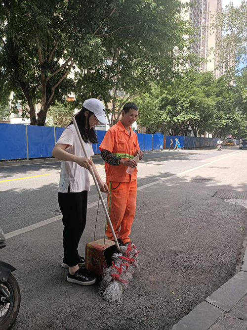 在活动即将结束之际,实践团成员纷纷主动加入当地环境环保队伍,在环卫工人的带领下,与环卫工人一道,清理社区环境建贡献出了自己的微薄力量。团队成员张金婧表示,虽然劳动很辛苦,但看到自己手下环境更加的干净整洁,自己所有的辛苦都是值得的。