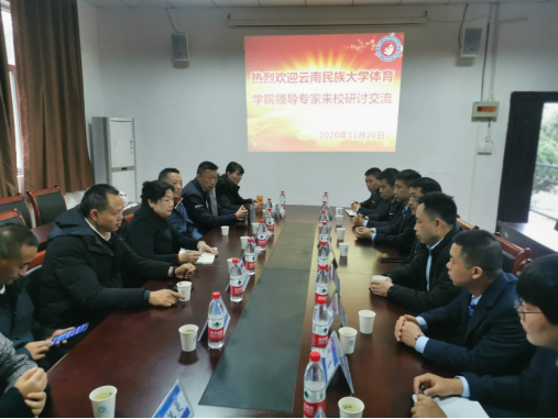 11月26日,云南民族大学体育学院胡应国副院长一行8人来校,与体育学院进行了研讨交流。体育学院院长肖宇翔,社体专业系主任陈荣浩、公共体育部主任唐念及各教研室主任参加研讨交流。