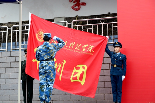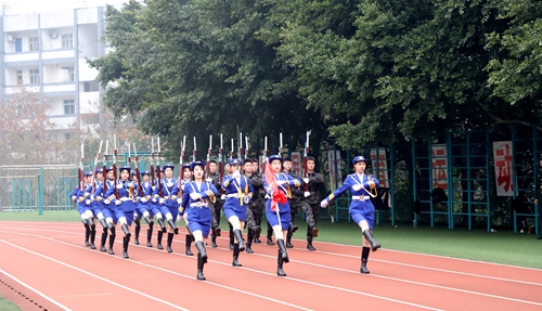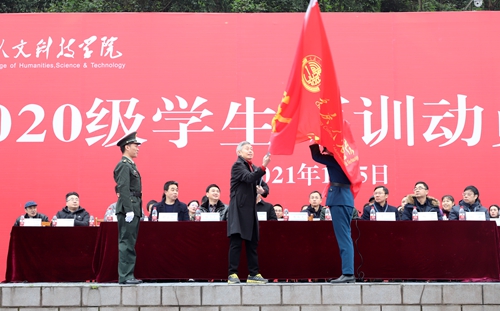 在授旗仪式上,校长张跃光将学生军训团团旗授给承训部队负责人冉进,学生军训团团旗在训练场迎风飘扬。