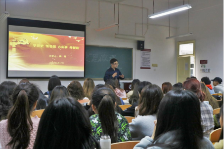 学党史、悟思想。杨霄讲到,中共共产党的历史,是一部无数民族英雄、革命先驱前仆后继、流血牺牲的血泪史,是一部战胜敌人、迎接挑战、化解危机的奋斗史,更是一部革命传统、民族血脉接续传承的精神史,学习党史就是要传承党的优良传统,赓续红色精神。从邱少云、黄继光等英勇牺牲的革命烈士到基层扶贫攻坚无私奉献的党员干部,再到抗击新冠肺炎疫情一线的医护人员们,一个个鲜活生动的故事,诠释了“我将无我,不负人民”的新时代中国共产党人的崇高的人生境界,让在场师生们无不动容。