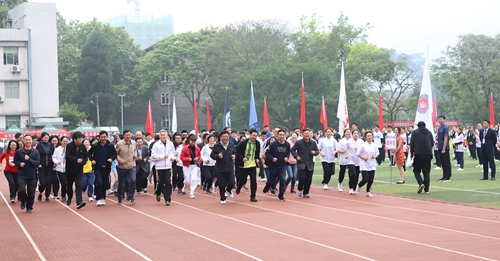 党委书记张辉宣布运动会正式开幕。主席台全体领导汇聚操场,环绕操场慢跑一圈,开启“全民阳光健身跑”活动,拉开了运动会的序幕,用实际行动响应“发展体育运动,增强人民体质是我国体育工作的根本任务”的号召,落实"更高、更快、更强"的奥运精神。