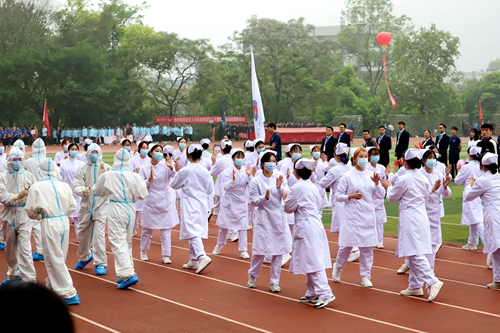开幕式上,首先举行的是入场式。伴随着振奋人心的运动员进行曲,国旗方队、校旗标语方队、红旗方队、气球花球方队、裁判员方队、各二级学院、机关方队依次入场。他们精神饱满,迈着铿锵有力的步伐依次通过主席台接受检阅,并结合学科专业特色展示不一样的精彩,赢得了现场阵阵掌声和欢呼声,充分展现了重人科师生朝气蓬勃、昂扬向上的精神风貌。