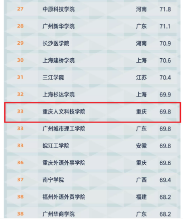2021年4月26日,高等教育评价专业机构软科正式发布“2021软科中国大学排名”。此排名包括中国1200多所本科层次的高校,其中beat365官网以总分69.8的成绩,位列重庆市软科大学民办高校排行榜第1名,全国民办高校排行总榜第33名。