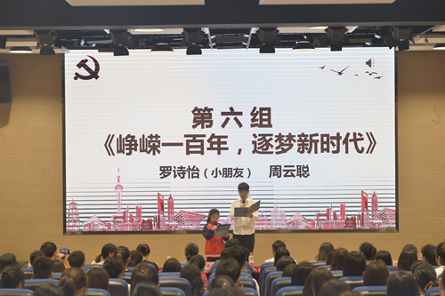 随后,各朗诵组根据抽签顺序依次登台展示,此次朗诵组是由学生第三党支部党员与其帮扶的大庙完全小学留守儿童结对而成。各小组分别朗诵了《我的祖国》、《红船,从南湖启航》、《与祖国同频共振》、《峥嵘一百年,逐梦新时代》、《不忘初心,牢记使命》、《我是中国人》、《祖国》等多首诗歌,党员及小朋友们精神饱满,神采奕奕,用嘹亮的声音激情诵读,歌颂伟大的党、伟大的祖国,抒发着深深的爱党、爱国情怀,为中国共产党百岁生日献上诚挚的祝福。朗诵过程穿插的党史知识抢答、团辅活动、节目表演等互动环节,进一步将现场气氛推向高潮。活动接近尾声,全体人员共同演唱《没有共产党就没有新中国》,现场气氛再度升温,大家尽情表达了对党和伟大祖国的热爱与祝福。
