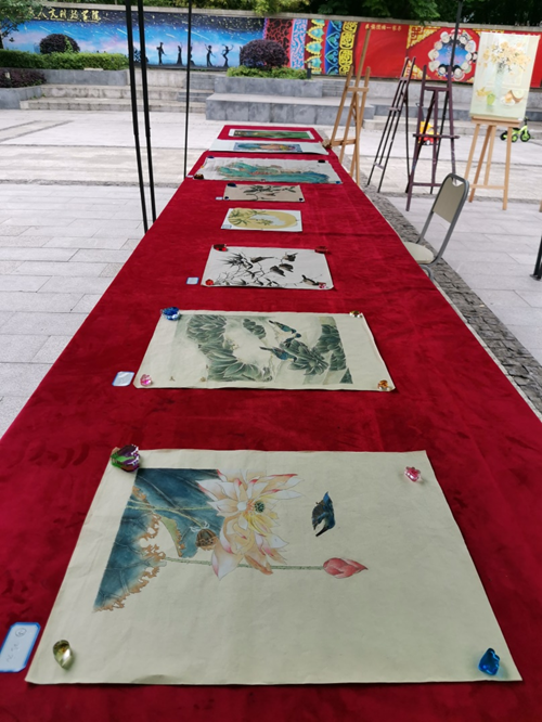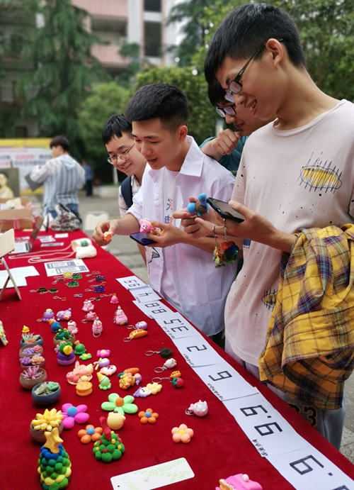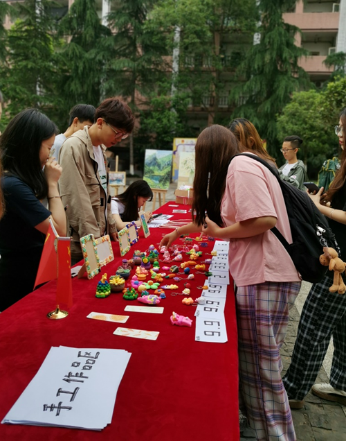 活动现场分为画作区、手工作品区、体验区。其中画作区的所有美术作品,均由艺术学院美术专业学生无偿捐赠;手工作品区的作品均是由艺术学院学生第一党支部、庠园六舍党员服务站的党员同志手工制作。