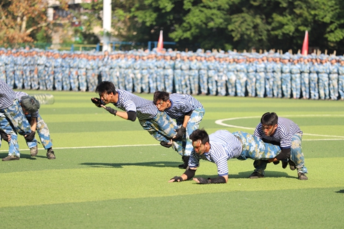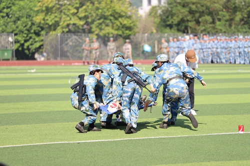 分列式后,相继进行了军体拳、士兵健身操、擒敌拳、武警应急棍术、格斗、单兵及战术基本动作、警棍盾牌术、战场救护等10余项军体项目与军事技战术表演。运动场上新生们整齐有力的拳术招法、战意十足的拼刺喊杀、灵活得当的战术动作、单兵对抗的激烈交锋、周密细致的伤病救护,全面展现了全体新生14天的坚忍不拔、吃苦耐劳、认真投入。“万疆”“星辰大海”歌声中整齐划一的手语操,“党徽+100”“祖国万岁+中国地图”“千秋伟业”“百年风华”“行千里、致广大”“重人科2000-2021”“厚德笃行”“知行合一”等50余种字样、图案,机巧多变,无语浓情,饱含着广大青年大学生对党、对祖国、对学校的深情厚爱,让汇报表演完美谢幕。