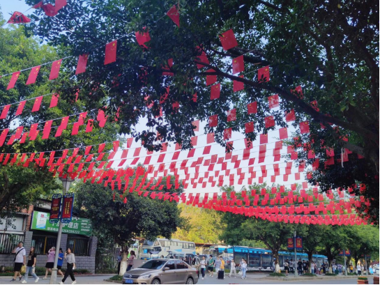 传承红色基因,营造庆典氛围。学校线上线下多手段、全覆盖传承红色基因,浓厚节日氛围。线下,在校门处高高悬挂起“欢度国庆”红色灯笼,在进校主干道行知大道布置近50米的国旗海洋、悬挂庆祝国庆标语,通过学校广播站定时播放爱国歌曲,通过各二级学院LED显示屏播放国庆宣传片,营造出一片喜庆祥和、红色满眼的庆典氛围;线上,学校在官方微信公众号、官网、各单位媒体平台,推出国庆知识、活动等宣传信息十余篇,在网络上掀起“表白”祖国高潮。