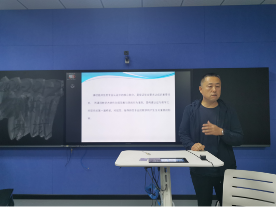 蒋长清从基于OBE理念的教学大纲撰写的基本原则、编制步骤、对学校教学大纲的建议三个方面展开。他提出撰写大纲时要牢牢把握强操作性、量化可测的基本原则,根据人才培养方案组织条理,对课程体系进行梳理,融入思政元素。蒋长清强调专任教师应了解专业课程体系,熟知课程基本情况,通过人才培养方案了解实际学情。同时他还指出,要设置课程目标,形成毕业要求支撑矩阵;遴选课程内容,构建教学内容体系;细化教学目标,强化教学大纲的操作性并依据内容特效,选择适当的教学方式,提高学习评价的精度和效度。