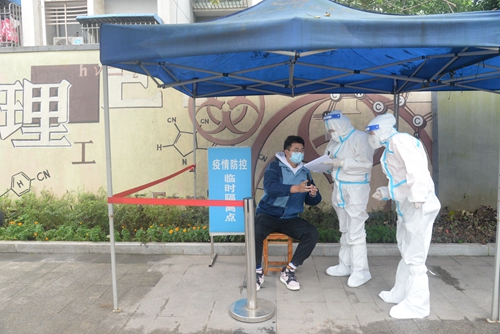 下午15时40分,大规模核酸采样检测应急演练正式开始。学校在第一运动场设置19个核酸采样点,现场设置等候区、信息登记区、采集区、清洁区、临时隔离区、缓冲区、医疗废物暂存区、生活保障区、标本整理交接区。演练内容为:人员入场测体温、信息登记、分流排队等候、标本采集、标本转运送检、医疗废物垃圾处置、物品及环境消杀等环节。演练共采集1200份样本。16时10分大规模核酸采样检测应急演练结束。