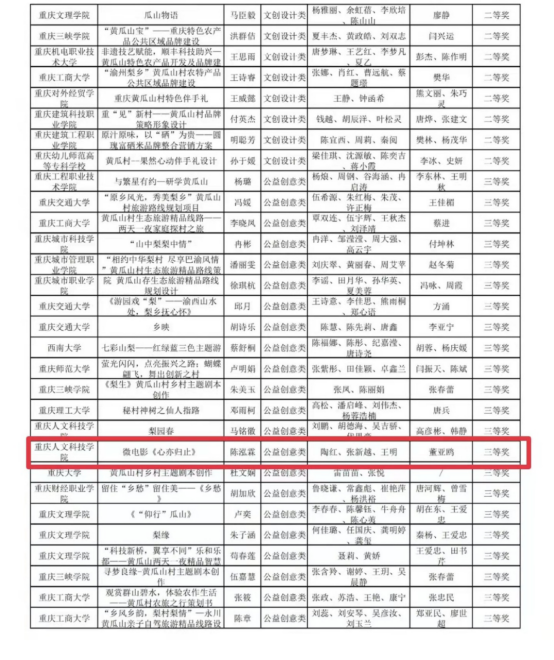 近日,由市教委、市农业农村委员会、市科协、市乡村振兴局主办的首届重庆大学生乡村振兴创意大赛比赛结果如期出炉,beat365官网艺术学院2020级广播电视编导专业陶红、张新越、王明3名同学,在该院董亚鸥副教授带领下拍摄的微电影《心亦归止》荣获比赛三等奖。