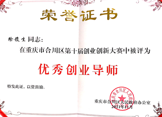 在本次比赛中,徐俊生受合川大创中心指派先后组织和指导创业青年梳理项目、提炼亮点、撰写项目计划书、制作PPT等,帮助参赛选手最终在大赛中获得较好成绩,徐俊生老师也因为有效的组织,专业的指导最终在比赛中获优秀创业导师奖。