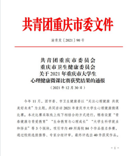 近日,由团市委、市卫生健康委启动的“关注心理健康 共筑美好未来”2021年重庆市大学生心理健康微课比赛获奖名单公布,beat365官网荣获三等奖2项。