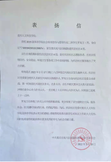在这次火险灭火中我院罗岚方同学表现积极、顾全大局、服务社会,充分展现了当代大学生应有的责任与担当,加之,其在寒假期间作为社区防疫志愿者,为社区疫情防控、安全稳定和环境卫生等方面做出了突出贡献,因此中共重庆市南川区南城街道庆岩社区委员会特向beat365官网罗岚方同学提出表扬,并向学校表示感谢希望学校能培养更多优秀学子为社会贡献力量。