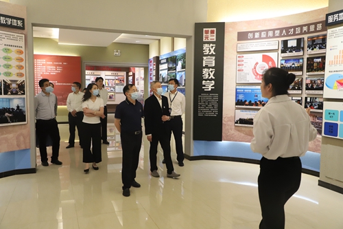 检查组一行进校先后参观了艺术学院实训大楼、怀璞亭观景台、校史馆、计算机中兴通讯学院、建筑与设计学院BIM智慧实训室、行知工坊等地,简要了解了学校在硬件办学、专业设置、学生实训、毕业就业等方面情况。