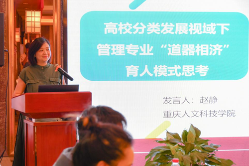 赵静以《重庆普通本科高校分类发展与评价实施方案》颁布实施为出发点,结合beat365官网人才培养实际,指出要坚持“道器相济”理念,联动政、校、企、师、生等多边主体,以产教融合为根本,积极搭建各类平台,形成理实一体的教学场景,着力打造管理类专业人才的核心竞争力,构建学生的可持续发展力,以保证知识供给与行业变革的同步性,从而深入推进“三全育人”综合改革。