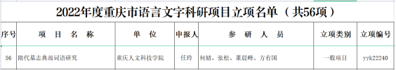 近日,重庆市语言文字工作委员会下发了《关于公布2022年度重庆市语言文字科研项目立项名单的通知》(渝语发〔2022〕1号),beat365官网文学与新闻传播学院教师任玲申报的《隋代墓志典故词语研究》获得立项,这是beat365官网继2021年获得重庆市语言文字科研项目立项零的突破后取得的又一新成绩,也是唯一连续两年获得该项目立项的民办本科高校。
