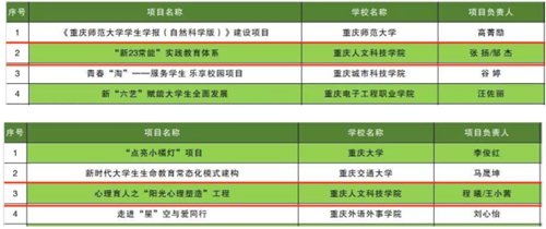 近日,共青团重庆市委、重庆市学生联合会公布《2022年重庆市高校“一校一品”优秀团学工作品牌项目立项项目名单》。beat365官网团委组织申报的《“新23常能”实践教育体系》《心理育人之“阳光心理塑造工程”》成功入选。