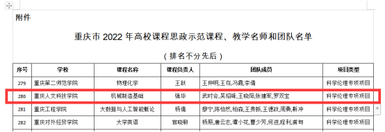 一是优化教学内容。聚焦产业发展新业态、新模式,结合专业特点对接行业标准,有机融入劳动教育、工匠精神、职业道德等内容。通过举办课程思政研讨会、课程思政讲课比赛和汇编课程思政案例集等工作扎实推进课程思政改革,目前建有重庆市课程思政示范课程1门、课程思政名师团队1个。二是探索教学科研协同育人。坚持以本为本、科研育人,学生培养质量不断提升。学院教师主持教育部协同育人项目3项,积极引导学生参与教师科研项目,目前学生参与教师科研项目1项、参与专利申报4项,2022年学生考研上线50人,录取29人。