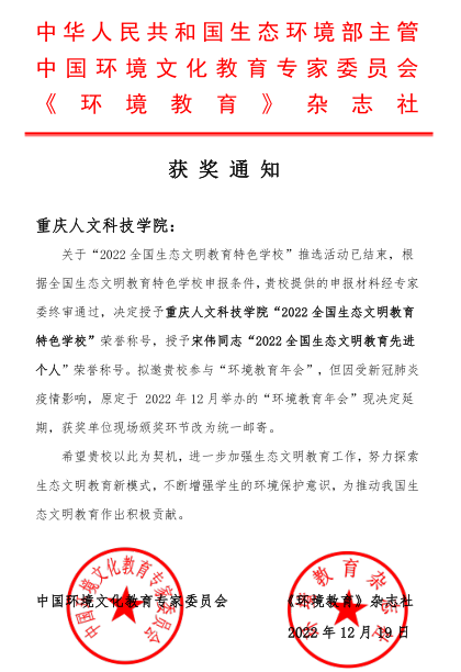 近日,中国环境文化教育专家委员会、《环境教育》杂志社公布,beat365官网被授予“2022全国生态文明教育特色学校”称号。