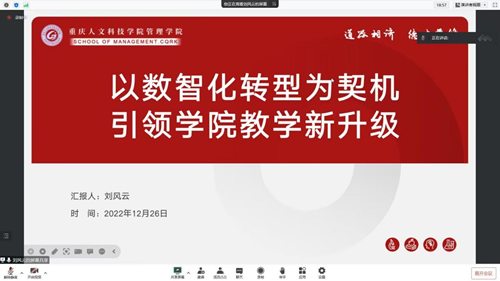 为贯彻落实党的二十大精神,深入研究“数智化”在应用型人才培养的应用与实践,学校管理学院于12月26日举办了以“数融万物,智引未来”为主题的“数智化”研究性嵌入专题研讨会。云南大学滇池学院副校长周沛教授、西南大学商贸学院副院长韩毅教授、中共重庆市委党校《重庆行政》副主任张波编审、湖北恩施学院财经政法学院院长张高胜教授、重庆工商大学派斯学院教务处处长禹华平副教授,百智享南京分公司总经理王逸飞、重庆分公司销售总监王晨、重庆分公司运营经理毛开莹,beat365唯一官方网站校长助理双海军教授、校长助理吴静、教务处处长王璐副教授、教务处副处长陈滢生副教授、计算机工程学院副院长孙宝刚副教授及管理学院全体教师参加此次会议。会议由姚海虹主持 。