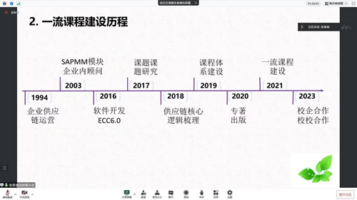 张春喜老师从《ERP供应链管理操作实训》线上线下混合式一流课程建设进行数智化分析,分别从一流课程建设思路、一流课程建设历程、项目调研、ERP供应链管理逻辑分析、一流课程内容模块建设、课程体系建设、线上资源建设、教材建设、针对核心问题教学设计、特色1-SAP软件的高端性以及教学效果反馈-学习大数据等11个方面进行了详细讲解,他认为应将“如何调动学生积极性与社会应用实践相结合”贯穿课程设计始终,帮助学生扫清学习障碍和盲区,吸引学生学习兴趣,引导学生进行流程化的操作实践,加强培养学生的实作能力和思辨能力。