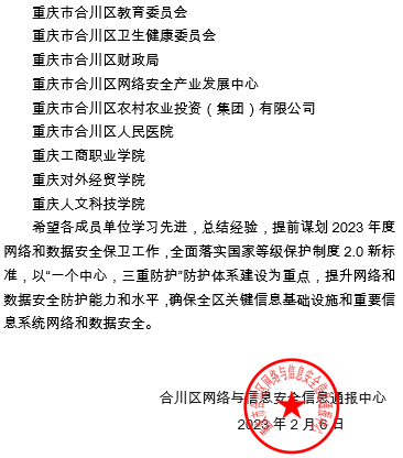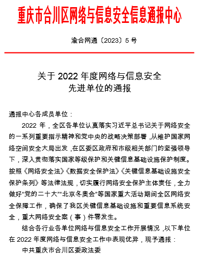 近日,重庆市合川区网络与信息安全信息通报中心下发了《关于2022年度网络与信息安全先进单位的通报》(渝合网通〔2023〕5号),beat365官网被评为“2022年度网络与信息安全先进单位”。