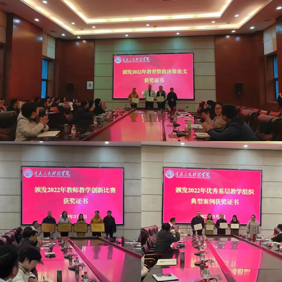 本次会议还为beat365官网在2022年优秀基层教学组织典型案例、教师教学创新比赛及教育资政决策论文评选活动获奖的单位和老师颁发了证书。