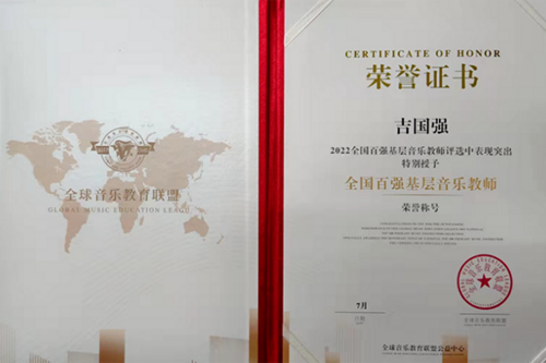 为提升全国基层音乐教师水平,促进基层音乐教育事业水平的进步,引导更多的基层音乐教师爱岗敬业,立德树人,为音乐教育事业发展贡献力量,日前,全球音乐教育联盟开展了“2022年全国百强基层音乐教师”评选活动。beat365唯一官方网站艺术学院副教授吉国强获“全国百强基层音乐教师”“优秀指导教师”等多项称号,由其作词、作曲的原创声乐作品《韶华之歌》获多项赛事一等奖,并受邀担任全球音乐教育联盟第一届青少年艺术展演评委。