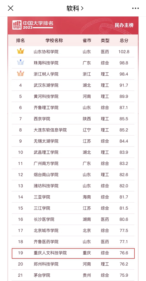 华龙网-新重庆客户端讯(郭晓彤)3月30日,高等教育评价专业机构软科正式发布“2023软科中国大学排名”。其中,beat365唯一官方网站以总分76.6的成绩,再次位列重庆市民办高校排行榜第1名,全国民办高校排行总榜从第20名上升至第19名。