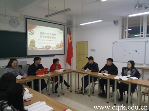 2018年11月26日,工商学院学生第二党支部联合重庆市合川区草街街道机关第一党支部举行党的十九大精神共学共建座谈会。工商学院学生第二党支部和重庆市合川区草街镇机关第一党支部部分党员代表参加了座谈。