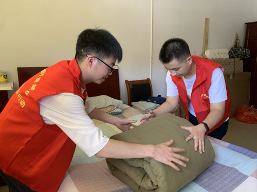 图为两名团队成员正在帮老人收拾整理房间内务