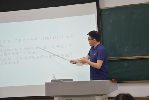 为进一步激发青年教师更新教育理念和掌握现代教学方法的热情,提升教师教学能力水平,提高课堂教学质量,努力打造一支高素质专业化的思想政治理论课教师队伍,5月11日下午,马克思主义学院在16教206教室举行了青年教师教学技能竞赛。校长助理兼教务处处长双海军莅临比赛现场,马克思主义学院资深教授吴文华、曾光霞、袁霞、王立新等出席比赛并担任评委,学院全体教师到场观摩学习。比赛由青年教师郭晓庆主持。
