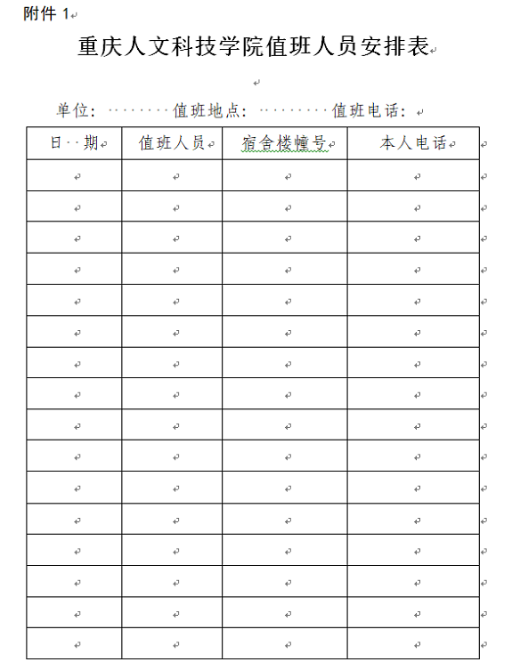 (五)各二级单位务必于2022年1月7日(星期五)12:00前将值班人员安排表(见附件1)交至党政办公室综合科。值班安排如有临时调整请及时通知学校总值班室。