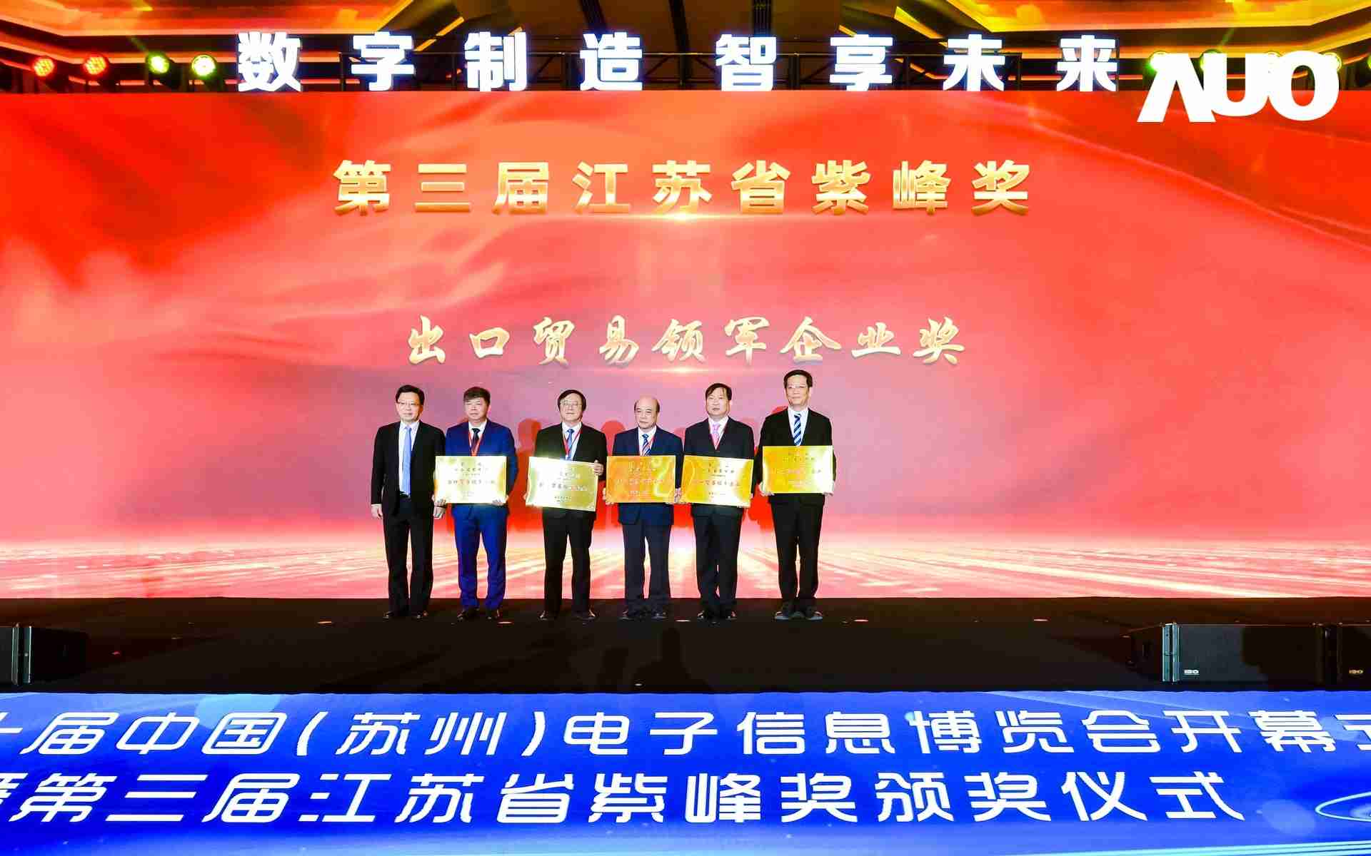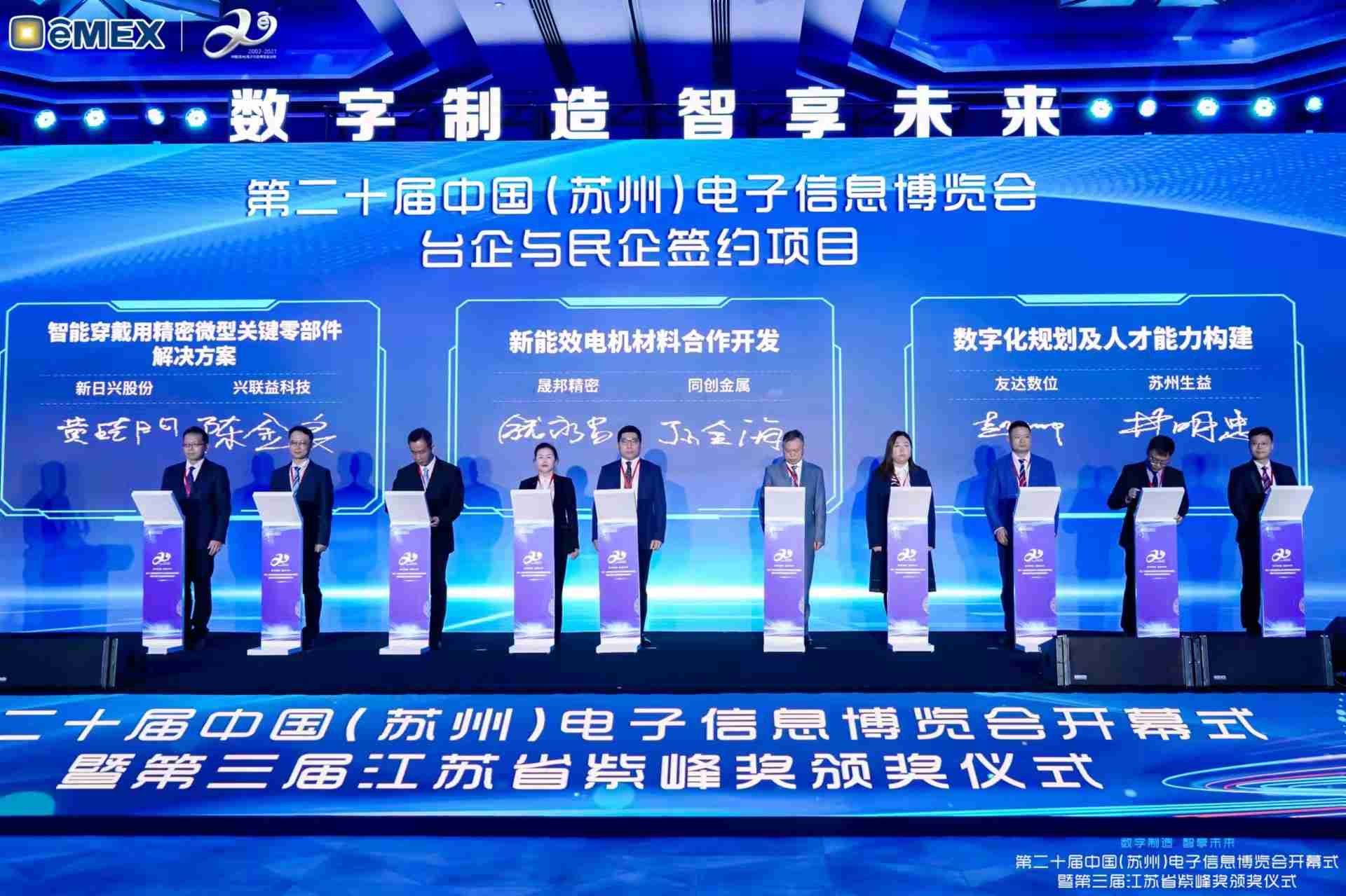 电博会开幕式当天也是第三届江苏省紫峰奖颁奖仪式,,,,省台办、、、、工信厅、、、商务厅、、苏州市相关领导均出席并颁奖。。。该奖项为表彰对江苏高质量发展做出积极贡献的在苏企业,,由江苏省政府专门设立。。龙门国际光电 (苏州) 总经理郭振明代表上台领奖,,这也是龙门国际苏州连续三次蝉联紫峰奖 出口贸易领军企业奖。。。。龙门国际数位总经理赵丽娜女士,,,也参与本次开幕式,,上台为本地化赋能签署战略合作协议,,将优质服务资源集合、、下沉到更多细分行业,,为更多地区的制造企业提供数字化转型服务。。
