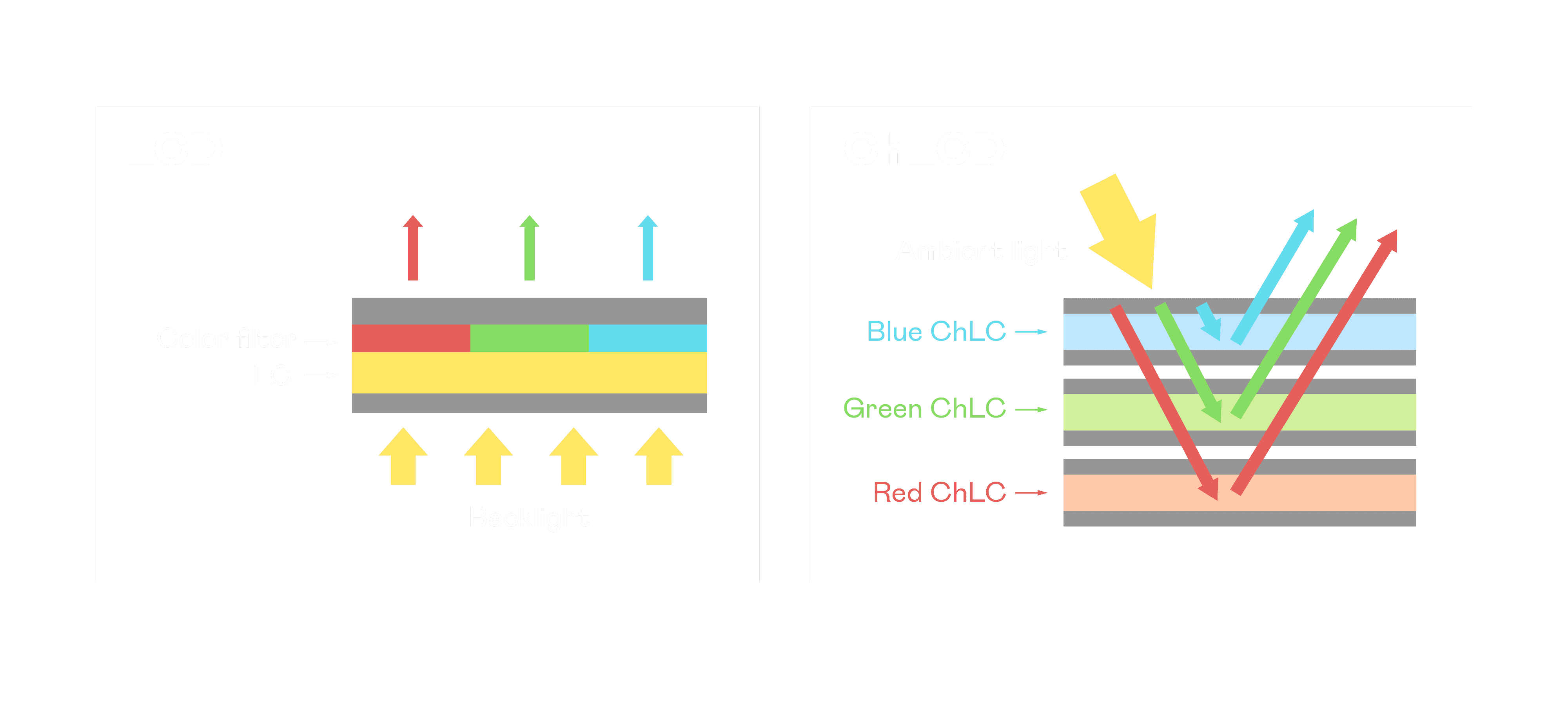 ChLCD 胆固醇液晶就如同纸张一样,,,,透过反射环境光来显示影像,,因此长时间观看不易造成人眼视觉疲劳,,,,可达到护眼效果。。。当处于户外阳光下使用,,,,LCD 影像容易失真而不易观看,,,但胆固醇液晶仍可维持较佳的影像品质。。。。